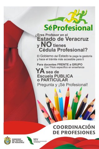 El beneficio de SE PROFESIONAL, es únicamente para docentes frente a grupo, de no serlo, tendrías que realizar el trámite de tu Cédula Profesional en cualquier momento en nuestras oficinas centrales en Xalapa ubicadas en Calle Federico Froebel No. 31-B, Col. del Maestro, por La Rotonda, o en las Delegaciones Regionales SEV de Coatzacoalcos, Tuxpan, Poza Rica, Martínez de la Torre, Cosamaloapan, Cordoba, Orizaba, Coatepec y Veracruz.